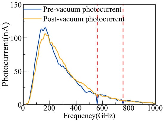 The amplitude of the photogenerated current before and after vacuum pumping. Red dashed lines: absorption peaks of water vapor at ~560 GHz and ~710 GHz.