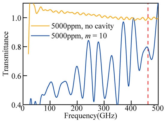 where ∆Tcavity and ∆Tref represent the difference between the transmission spectrum value at the frequency of the absorption peak and the initial transmittance. Under ideal conditions, the transmission spectrum without the cavity should appear as a horizontal line with a constant value of 1, except in the vicinity of the absorption peak (indicated by the red line in Figure 9). However, as can be observed in Figure 9, the yellow line exhibits irregular oscillations, indicating deviations from the ideal transmission spectrum. The oscillations originate from multipath interference, where terahertz waves reflect repeatedly at interfaces such as the vacuum chamber’s input/output windows and off-axis parabolic mirrors. The reflected signals remain embedded in the main signal and cannot be isolated in the time domain []. At this stage, the absorption effect of 5000 ppm CO measured directly by THz-FDS is significantly weaker than the observed oscillations (as previously determined, the detection limit for direct measurement is 7%). As a result, the gain factor F calculated under these conditions is inaccurate. To address this issue, we introduced a new reference: the transmission spectrum of 0 ppm CO under the same mode (m = 10). This reference spectrum was used to replace ∆Tref in the gain factor formula. After this substitution, the results are shown in Figure 10. The recalculated gain factor F is approximately 1100%, demonstrating a substantial enhancement effect when the FP cavity is utilized. This approach not only resolves the inaccuracy caused by the weak absorption signal but also provides a more reliable metric for evaluating the performance of the cavity-enhanced detection system.