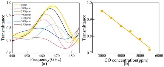 Starting from 3000 ppm, we measured CO concentrations in increments of 500 ppm, ultimately obtaining six data points ranging from 3000 ppm to 5500 ppm, as shown in Figure 11a. To ensure statistical rigor, each concentration was tested ten times, and the average value was used as the final result. Due to the collision broadening effect between gas molecules, as the concentration of carbon monoxide increases, the average distance between molecules decreases and the collision frequency rises. Collision-induced inter-molecular electric field disturbances cause the ground state energy levels to rise or the excited state energy levels to fall, resulting in a reduction in the transition energy []. This is reflected in Figure 11a as a redshift of the carbon monoxide absorption peaks and a decrease in the sharpness of the coupling position of the cavity resonance peaks. The results demonstrate that the system achieves a detection limit of 3500 ppm, representing a 14-fold improvement compared to the detection limit without the FP cavity. As shown, even at lower gas concentrations, the FP cavity produces significant absorption effects. This occurs because the cavity’s transmittance is highly sensitive to intracavity material losses. By adjusting the cavity length to couple the FP cavity’s resonance peak with the gas absorption peak, the transmitted intensity becomes extremely responsive to gas concentration changes, enabling detection through the decrease in transmittance at the resonance point. This enhancement is equivalent to extending the effective optical path length from the original 1017 mm to approximately 14 m, highlighting the system’s exceptional sensitivity. We extracted the maximum transmittance values of the cavity under different carbon monoxide concentrations, as shown in Figure 11b. The results demonstrate a strong linear correlation between transmittance and CO concentration above 3500 ppm.