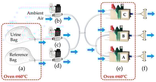PEEK chambers setup. It represents the urine and reference bags (a), the valves that control the ambient air (b), urine sample (c) and reference air (d) lines, the E-Nose PEEK chambers A, B and C (e), and the vacuum pumps connected to them (f).