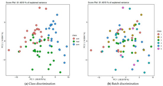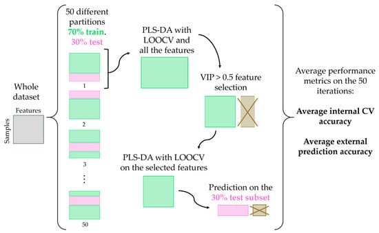 For each partition, PLS-DA [] was applied to the scaled and centered training set, using leave-one-out cross-validation (LOOCV) [,,]. Models with 1 to 10 latent variables (LVs) were evaluated, selecting the number maximizing cross-validation (CV) accuracy []. Accuracy was used as a figure of merit for the classification performance []. The VIP (Variable Importance in Projection) score was calculated for each feature, and features with VIP ≥ 0.5 were selected [].