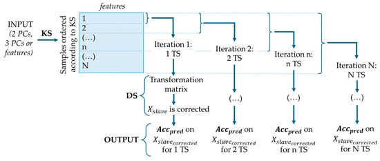 Transfer Sample selection was explored under four scenarios: (i) all synthetic mixtures combined, and (ii–iv) each of the three recipes individually. For each algorithm and scenario, Direct Standardization was applied iteratively with increasing numbers of Transfer Samples to compute the standardization matrix, adjust the slave data, and predict using the master model. Classification accuracy and the number of Transfer Samples were recorded at each step. The number of TS was chosen based on the maximum accuracy value.