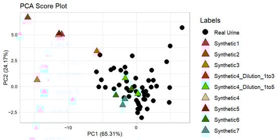 In this study, calibration transfer techniques using synthetic urine were investigated. The goal was to transfer classification models between nominally identical E–Noses. These models were developed to distinguish between different classes of human urine samples. Multiple samples of human urine were collected anonymously from different individuals to prepare six distinct batches, exhibiting natural variability. Each batch was created by pooling approximately samples from 15 different individuals, for a total volume of about 2 L per batch. Because the samples composing a batch came from different people, the chemical composition and concentrations of compounds vary, making the batches completely distinct from one another. Each of these six batches was then divided into three classes to be classified. A portion was kept unaltered (pure urine); in the two other portions 4-heptanone (0.625 μL/Lurine) and acetone (3.25 μL/Lurine) were added, respectively, in quantities that are in the range of those naturally found in human urine []. The purpose of this study was not to reproduce the full complexity of disease-related VOC profiles, but to mimic the varying levels of VOC biomarkers found in urine as indicators of various pathologies while keeping the experimental design relatively simple and well-controlled to focus on the methodological development. In this context, the choice of 4-heptanone and acetone was based on prior findings demonstrating a correlation between their varying concentrations with prostate cancer [].
