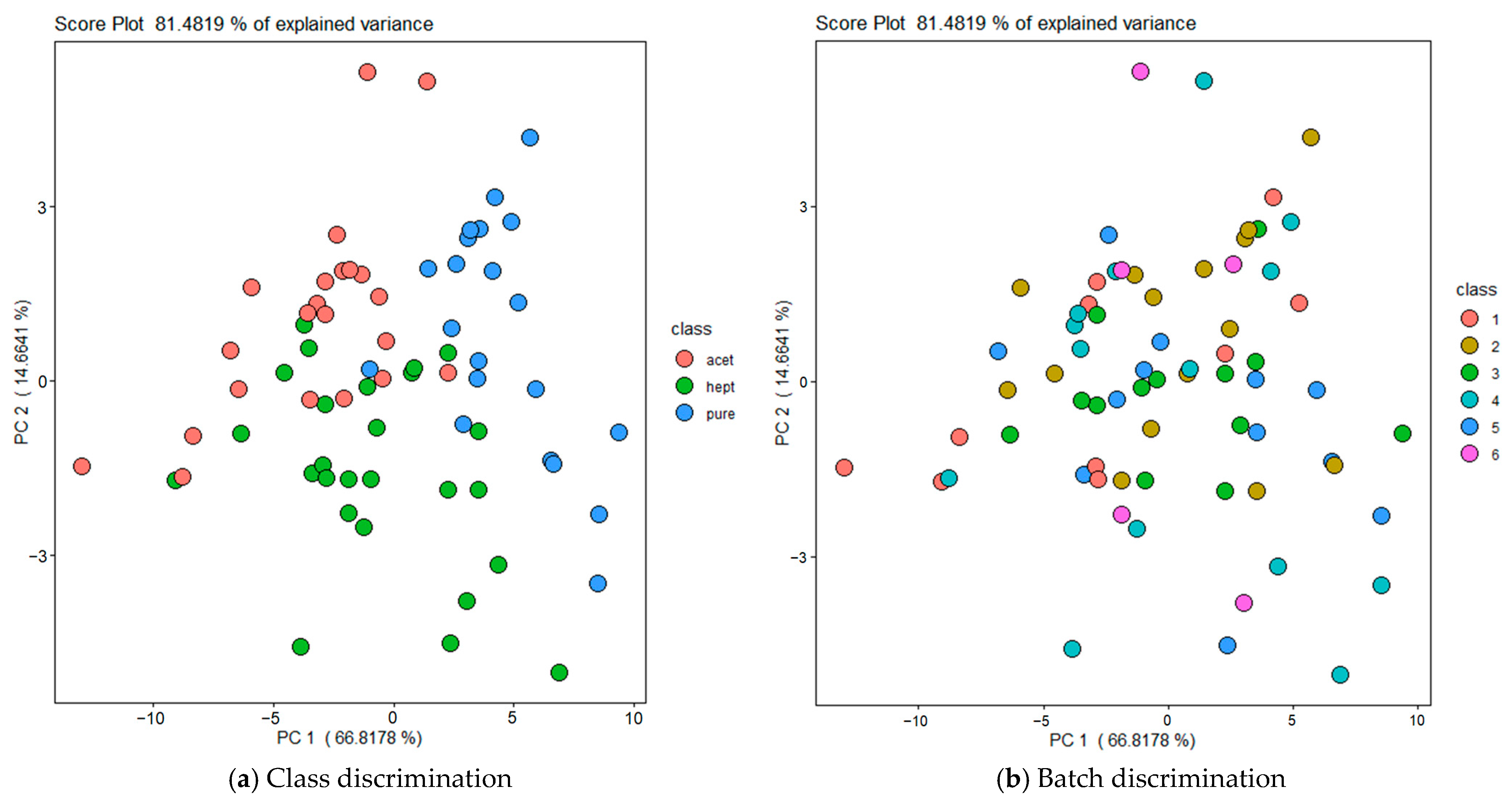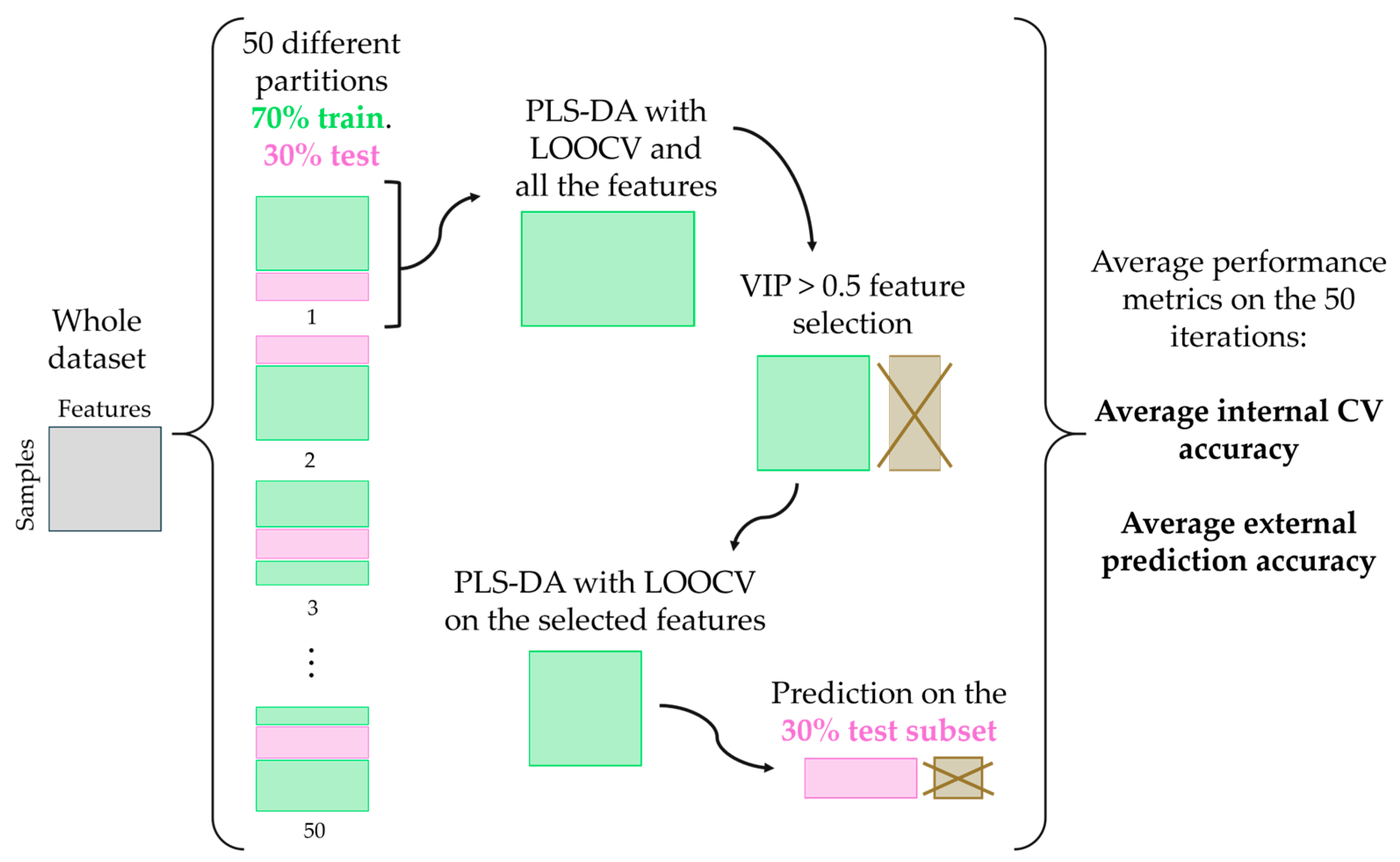- Szymańska, E.; Saccenti, E.; Smilde, A.K.; Westerhuis, J.A. Double-Check: Validation of Diagnostic Statistics for PLS-DA Models in Metabolomics Studies. Metabolomics 2012, 8, 3–16. [Google Scholar] [CrossRef]