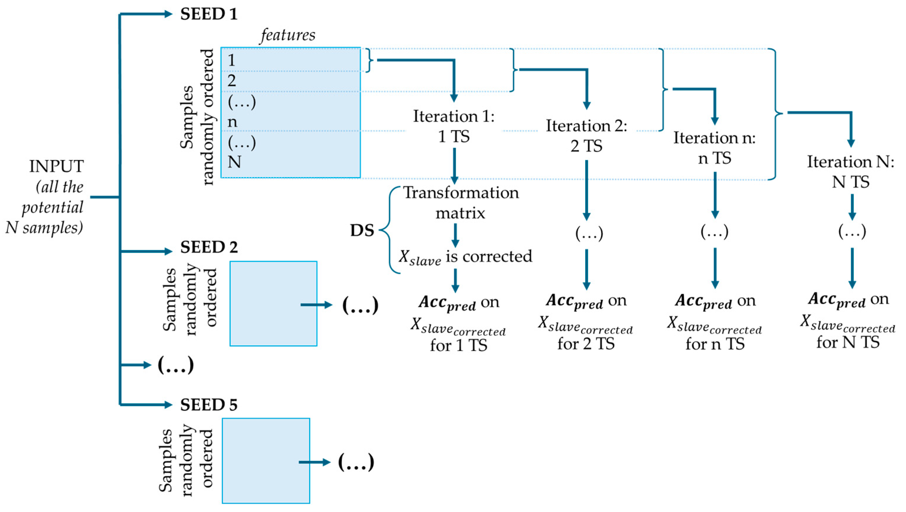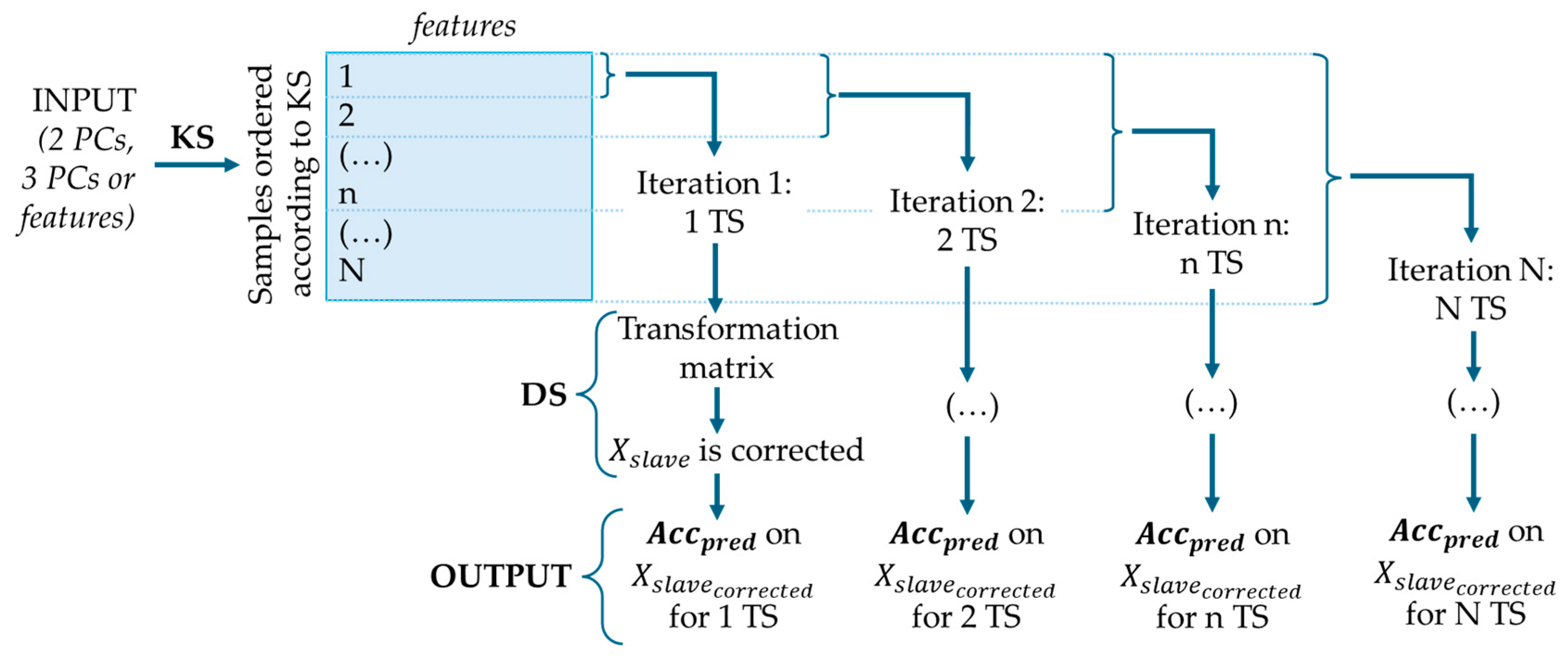 | Master–Slave | Prediction Accuracy Without DS Correction | Prediction Accuracy with DS Correction and No. of Transfer Samples (TS) | Method and Synthetic Mixture(s) Used |