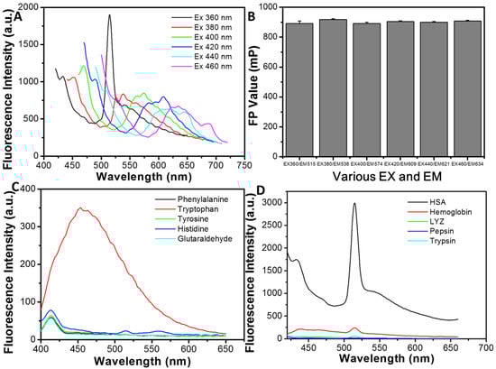 (A) The fluorescence emission spectra of HSA NPs with different excitation wavelengths. (B) The FP values of HSA NPs measured at various excitation and emission wavelengths. (C) The fluorescence emission spectra under 360 nm excitation of the prepared solution with various amino acids as raw materials. (D) The fluorescence emission spectra under 360 nm excitation of the prepared solution with various proteins as raw materials.