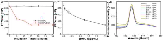 (A) The FP value changes in HSA NPs and HSA NPs incubated with 2.5 μg/mL of DNA-1 in 30 min. (B) The FP value changes in HSA NPs incubated with different concentrations of DNA-1 for 20 min. (C) The fluorescence emission spectra of HSA NPs incubated with different concentrations of DNA-1 for 20 min.