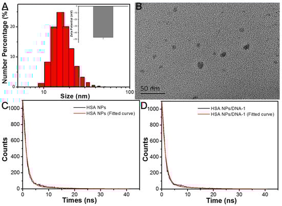 (A) Hydrated size distribution and zeta potential measurement of HSA NPs/DNA-1. (B) TEM image of HSA NPs/DNA-1. (C) The fluorescence decay curve and fitted curve of HSA NPs with 360 nm excitation and 515 nm emission. (D) The fluorescence decay curve and fitted curve of HSA NPs/DNA-1 with 360 nm excitation and 515 nm emission.