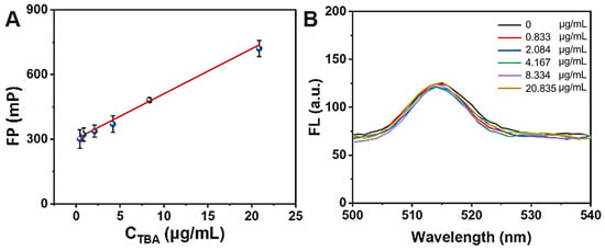 Previous studies have demonstrated that aptamers DNA-2 and DNA-3 exhibit high affinity for TBA [,]. Based on this observation, we speculated that DNA-2 or DNA-3 preferentially binds to TBA rather than to HSA NPs [,]. Figure 7A,B displayed the FP changes in the HSA NPs solution incubated with different concentrations of DNA-2 and DNA-3 for 20 min. The results indicated that the FP value of the HSA NPs solution significantly decreased after the addition of DNA-2 or DNA-3. The varying trend is consistent with the addition of DNA-1. According to the above results, the addition of DNA-1, DNA-2, or DNA-3 can induce changes in HSA NPs from an aggregate state to a dispersed state. The FP value of HSA NPs in a well dispersed state is about 280 mP. Herein, we further investigated the FP changes in the HSA NPs incubated with 2.5 μg/mL of DNA-2 and various TBA concentrations (CTBA). As shown in Figure 8A, the FP value of the HSA NPs/DNA-2 system gradually enhanced with the increase in CTBA from 0 to 20.84 μg/mL. Moreover, the relationship between the FP value and CTBA in the range of 0−20.84 μg/mL can be well described by the following equations:
