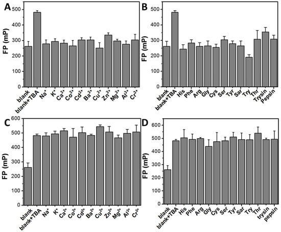 Selective and anti-interference performance for TBA. (A) The FP value of HSA NPs/DNA-2 incubated with 8.334 μg/mL of TBA or various metal ions for 20 min. (B) The FP value of HSA NPs/DNA-2 incubated with 8.334 μg/mL of TBA or various biomolecules for 20 min. (C) The FP value of HSA NPs/DNA-2 incubated with 8.334 μg/mL of TBA and 8.334 μg/mL of various metal ions for 20 min. (D) The FP value of HSA NPs/DNA-2 incubated with 8.334 μg/mL of TBA and 8.334 μg/mL of various biomolecules for 20 min.