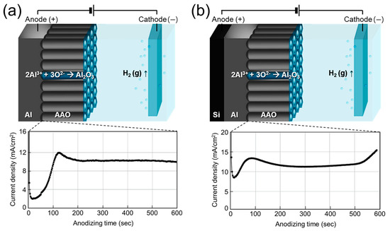 Schematic illustration of the anodizing mechanism of (a) freestanding 60 μm Al foil and (b) 1 μm Al deposited on Si wafer, with corresponding current density–time transients over 600 s.