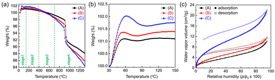 Surface morphology was examined by scanning electron microscopy (SEM, Hitachi S-4800, Tokyo, Japan) equipped with energy-dispersive spectroscopy (EDS). Crystalline phases were identified by X-ray diffraction (Rigaku D/max 2400, Rigaku Corporation, Tokyo, Japan). Static water contact angles (CA) were measured at room temperature with a horizontal microscope and protractor eyepiece, using five droplets per sample. Cross-sections were prepared by diamond cutting and imaged by SEM. Thickness and porosity were measured from SEM images using Image Tool software. Thermogravimetric analysis (TGA, PerkinElmer TGA-7, PerkinElmer, Inc., Waltham, MA, USA) was performed in argon from 30 °C to 1300 °C at 10 °C/min with 20 mL/min gas flow. Moisture adsorption/desorption isotherms were collected at 25.15 °C and 0–95% RH (BELSORP-aqua3, BEL Japan, Tokyo, Japan) after pre-dehydration at 300 °C for 24 h. RH was defined as p/p0, where p is the partial pressure of water vapor and p0 its saturation pressure at 25.15 °C. Infrared spectra were recorded using a Nicolet iS10 FTIR (Thermo Fisher Scientific, Waltham, MA, USA) after moisture adsorption and evacuation to 10% RH at room temperature.