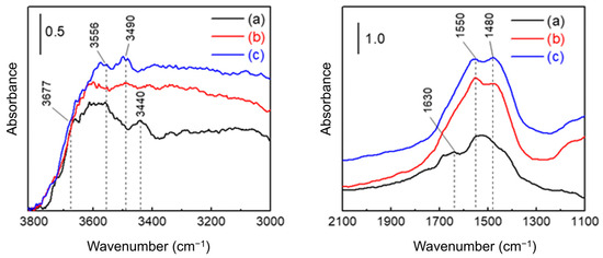 FT-IR spectra of AAO membranes (a) as-prepared and after pore-widening for (b) 1 h and (c) 2 h. All spectra were recorded after moisture adsorption and evacuation to 10% RH at room temperature.
