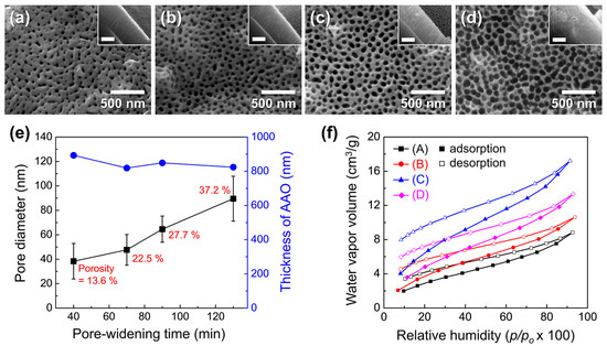 FE-SEM images of AAO surfaces on t-Si after pore widening for (a) 40, (b) 70, (c) 90, and (d) 130 min. Insets show corresponding cross-sectional views (scale bars: 500 nm). (e) Pore diameter (black) and film thickness (blue) as a function of pore-widening time; porosity values are indicated in red. (f) Moisture adsorption–desorption isotherms measured at 25 °C for samples with different porosities: (A) 13.6%, (B) 22.5%, (C) 27.7%, and (D) 37.2%.