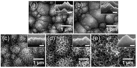 Building on the preceding investigations of surface roughness and crystallinity effects, we further examined how surface functionalization contributes to wettability by inducing hydroxyl-rich phases through hot-water treatment (boehmitization). Figure 14 shows the morphological evolution of porous AAO/t-Si after immersion in boiling water (≈100 °C) for different times. After 2 min, the nanopores began to seal and small hydrate nanoparticles appeared on the surface (Figure 14b) [74]. Immersion for 5 min led to the emergence of flake-like structures, often described as flower- or petal-like, which progressively grew into dense sheet-like networks as immersion time increased to 10 and 15 min (Figure 14c–e).