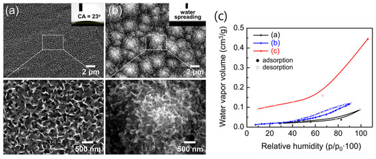 Low- and high-magnification SEM images of (a) flat Al/Si and (b) hierarchical AAO/t-Si surfaces after hot-water treatment for 10 min. Insets show WCAs. (c) Moisture adsorption/desorption isotherms of (a) as-prepared AAO/t-Si, (b) 800 °C-calcined Al2O3/t-Si, and (c) hot-water-treated boehmite [AlO(OH)]/t-Si surfaces.