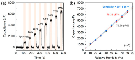 Humidity sensing characteristics of the AAO/t-Si structure. (a) Dynamic response to stepwise RH changes from 10% to 80%. (b) Static capacitance–RH response and linear fits for three representative devices (n = 3), showing calculated sensitivities.