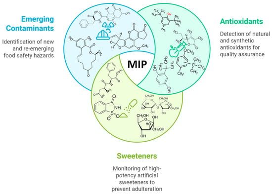 Schematic illustration of the key areas of interest in food quality control using MIP electrochemical platforms: antioxidants, sweeteners, and emerging contaminants.
