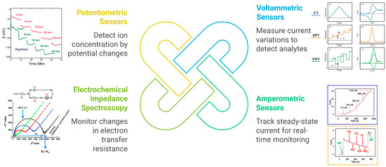 When integrated into an electrochemical sensor, the MIP serves as the selective recognition element, while the electrode transduces the binding event into a measurable electrical signal. Crucially, specific molecular interactions within the MIP—electrostatic pairing, hydrogen bonding, and π–π stacking—alter interfacial charge transport (film permeability, local double-layer structure, and the heterogeneous electron-transfer rate constant), which is what the electrode ultimately reads. Several transduction modes are commonly employed (Figure 3):
