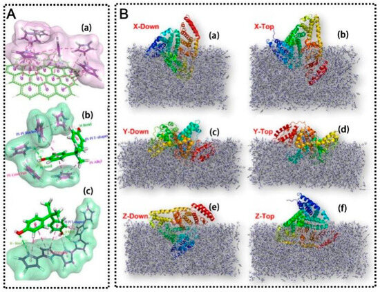 (A) (a) π-π interaction between graphene with pyrrole molecules. (b) Energy minimized monomer–template complexes. (c) Auto Dock docked pose of PPy with BPA [60]. (B) Global views of the BSA protein embedded in the MIP along the (a) X-Down direction, (b) X-Top direction, (c) Y-Down direction, (d) Y-Top direction, (e) Z-Down direction, and (f) Z-Top direction [61].