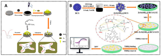 Examples of MIP-based electrochemical for different synthetic antioxidants sensing. (A) MIP/MoS2/AgNPs-CS/GCE for BHA detection [64]. (B) MIG-ZrO(OH)2@HCS/GCE for TBHQ detection [118].