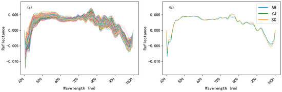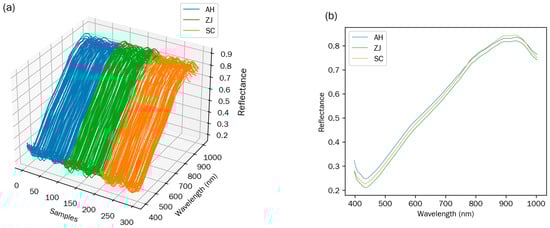 Figure 4 presents the raw spectra and average spectra of RAM from three origins. The comparison results showed that the variation trends of the spectral curves for the three origins were extremely similar. This similarity indicated that the material compositions of their main chemical components were alike [6]. Figure 4b depicts that the spectral reflectance slightly decreases within the 397–430 nm and then begins to rise from 430 nm. Notably, a distinct reflectance peak appears between 920 nm and 950 nm. This peak was probably caused by the second overtone of O-H stretching of water [36,37]. Furthermore, no significant peaks were identified in this study. This makes it challenging to identify RAM origin merely by visually examining the spectral characteristics. Therefore, it is imperative to conduct more in-depth analysis and processing of the spectra to explore the latent features concealed within the sample spectra.
