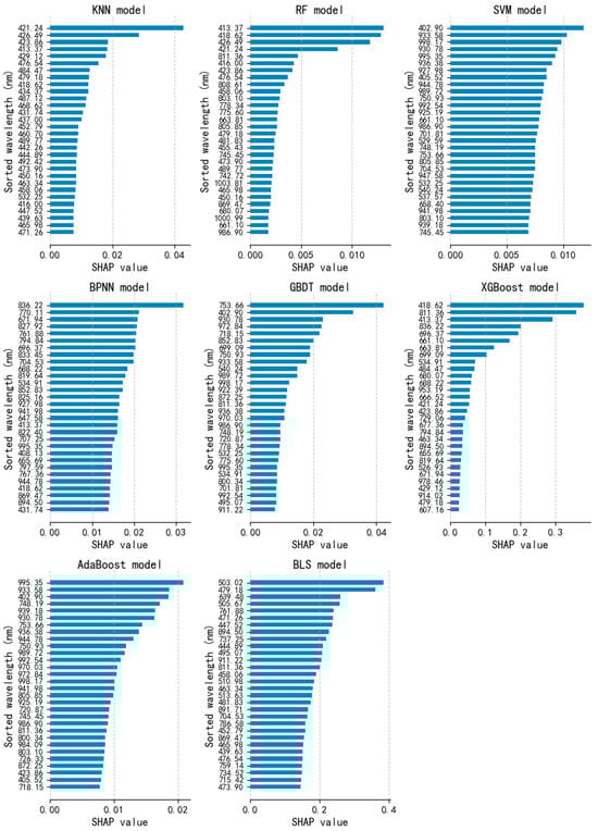 In this study, SHAP was used to explain the decision-making of KNN, RF, SVM, BPNN, GBDT, XGBoost, AdaBoost, and BLS models based on full-wavelength data. The mean absolute SHAP values were calculated to determine the significance of each spectral wavelength in the model outcome. The larger the SHAP value, the greater the impact of feature wavelength on the model classification results. Additionally, given that the number of full wavelengths was too large (224 features), only the top 30 important features were visualized. After that, secondary modeling was performed based on these important features to build the simplified models.