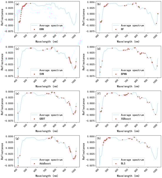Top 30 important wavelengths independently screened by each model (KNN, RF, SVM, BPNN, GBDT, XGBoost, AdaBoost, and BLS) based on SHAP explanation.