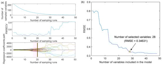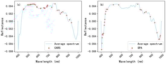 The competitive adaptive reweighted sampling (CARS) and successive projection algorithm (SPA) are two classic wavelength selection methods that effectively address the high-dimensionality of hyperspectral data by eliminating irrelevant, noisy, or collinear variables [33,34]. CARS is a variable selection method integrating Monte Carlo sampling with partial least squares regression model regression coefficients, which iteratively screens high-weight wavelengths and eliminates redundant variables [21]. SPA is a forward wavelength selection method dedicated to selecting wavelength combinations with minimal information redundancy to address collinearity issues [35].