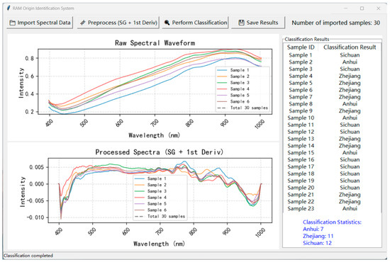 The RAM origin identification system deploys the trained BLS model through serialization, where the optimized model parameters and label encoder are saved as “bls_model.pkl” and “label_encoder.pkl” using the joblib library in Python. As shown in Figure 12, the system visually presents both raw and preprocessed spectra, outputs sample origin results through the classifier, provides statistical summaries, and enables the export of classification outcomes. This deployment approach ensures efficient model reuse, allowing the system to directly leverage pre-trained knowledge for RAM origin identification without retraining, which enhances the practical applicability and computational efficiency in real-world scenarios.
