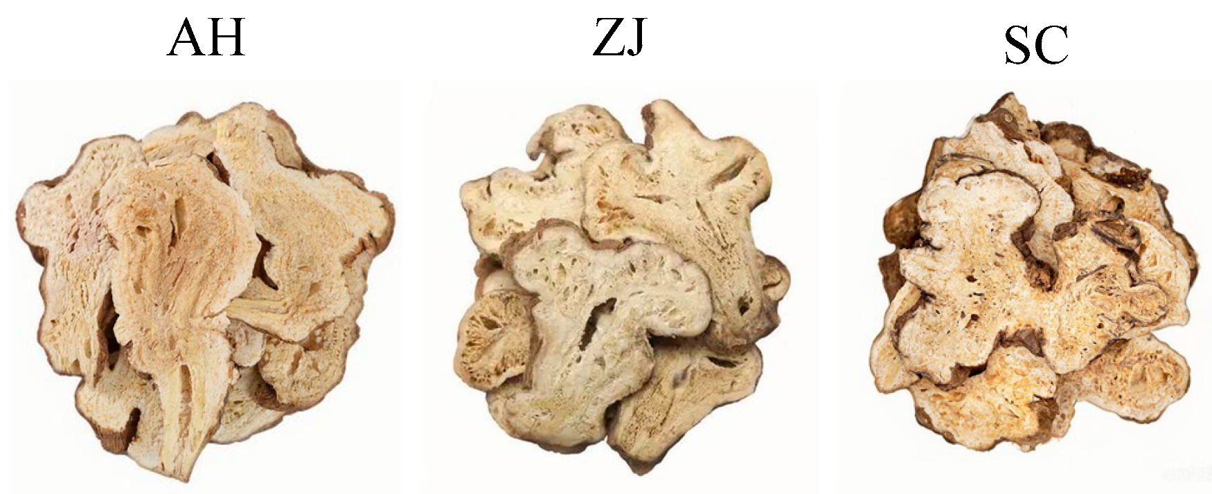 RAM samples collected from three geographical origins in China: Anhui province (AH), Zhejiang province (ZJ), and Sichuan province (SC). The 100 RAM samples per origin were purchased from local medicinal material markets of each origin. All were three-year-old specimens consistent with mainstream commercial specifications in the Chinese market, and had been processed into slices for commercial sale. Figure 1 presents the images of RAM from the three geographical origins. It is extremely difficult to distinguish RAM from different origins based on their appearance characteristics.