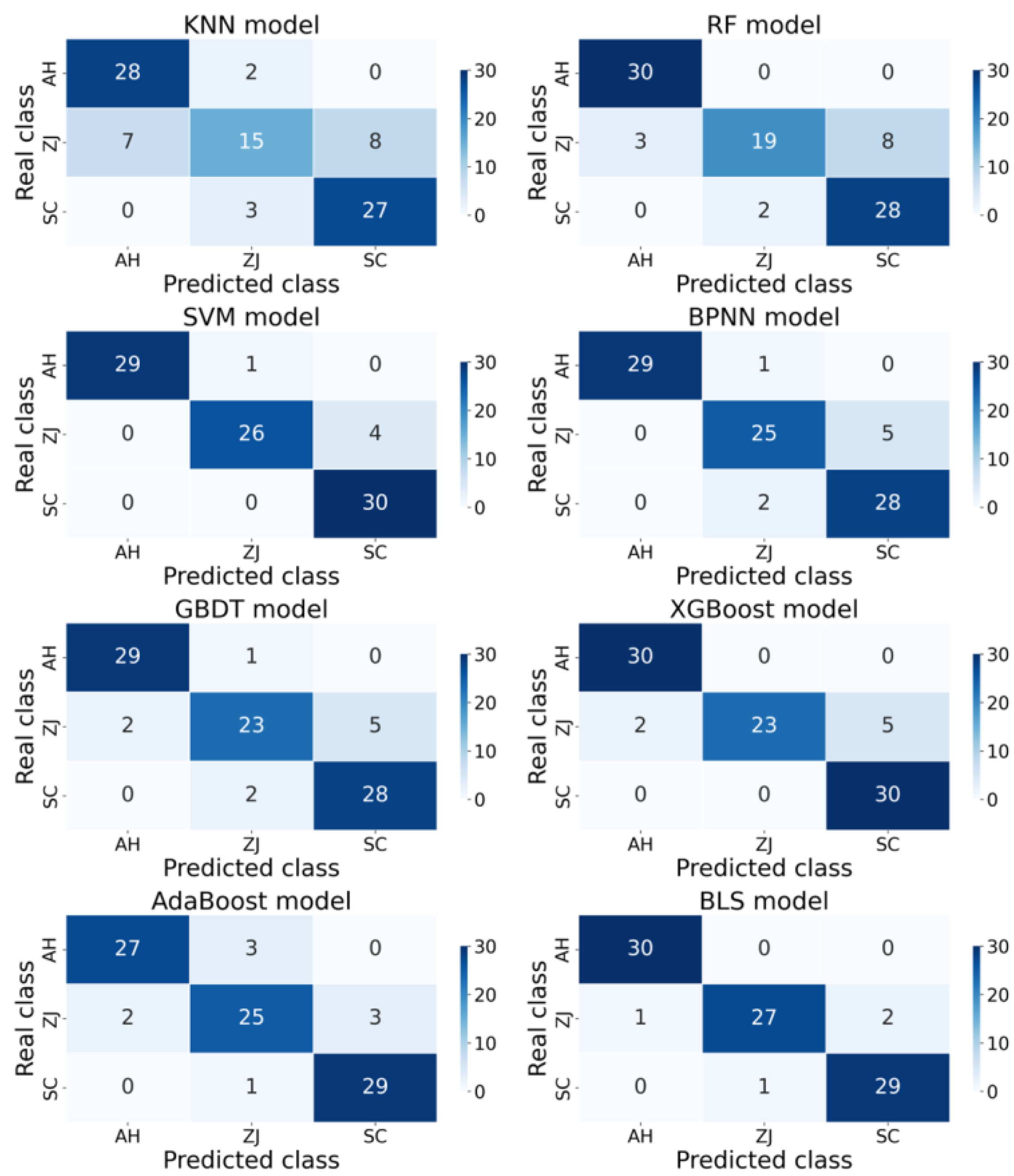 To intuitively and comprehensively analyze the classification performance of all models, confusion matrices for various models were plotted, as shown in Figure 7. A comparative analysis revealed that the numbers of misclassifications in the origin identification of RAM by the KNN, RF, SVM, BPNN, GBDT, XGBoost, AdaBoost, and BLS models were 20, 13, 5, 8, 10, 7, 9, and 4, respectively. Further observation of the confusion matrices of all models showed that RAM originating from ZJ was most prone to misidentification. Notably, compared with other algorithms, the BLS model performed exceptionally well in mitigating this issue, significantly reducing the misclassification rate of ZJ-origin RAM, which further highlighted its remarkable advantages in RAM origin identification tasks.