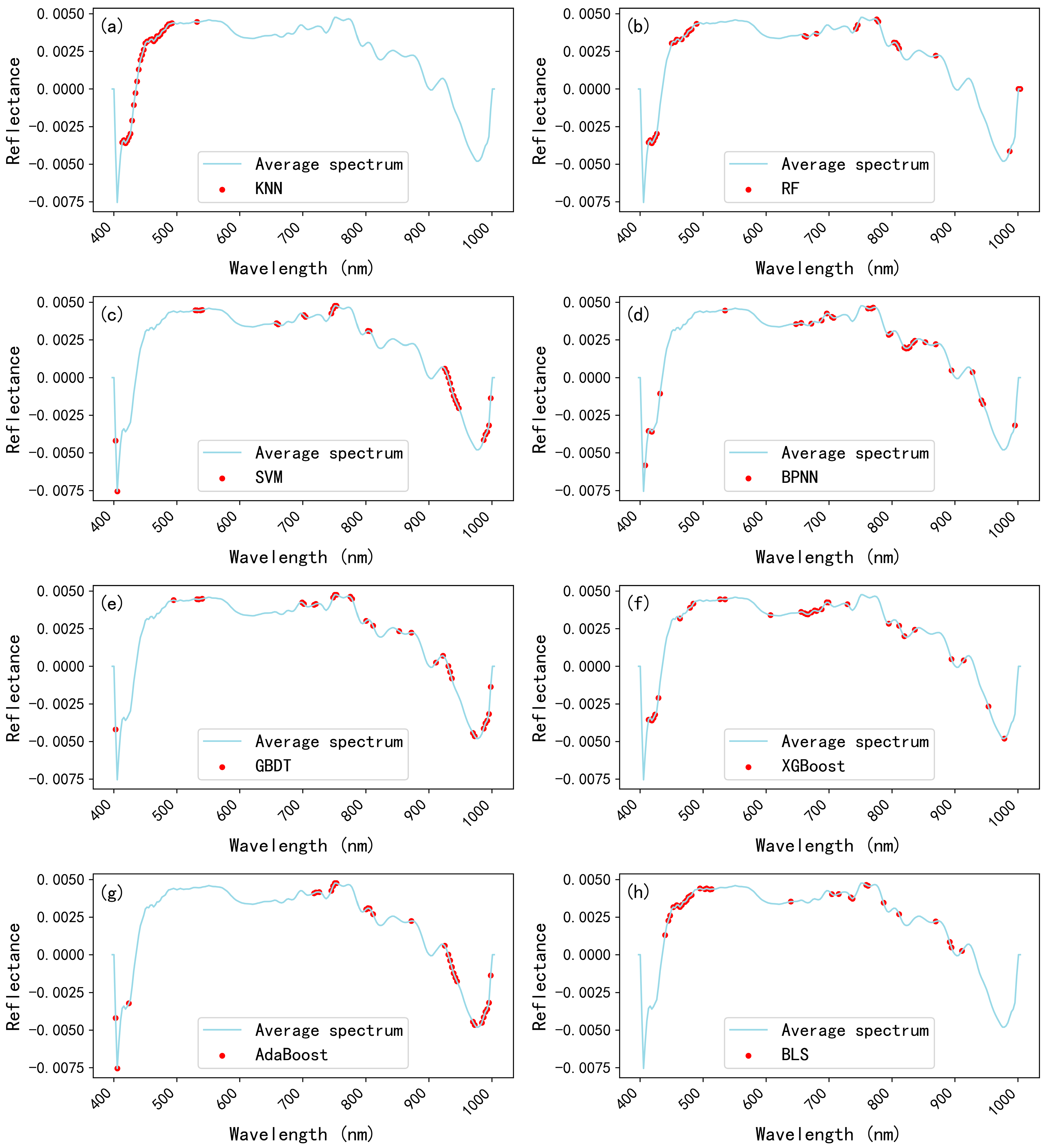 Figure 8. Top 30 important wavelengths independently screened by each model (KNN, RF, SVM, BPNN, GBDT, XGBoost, AdaBoost, and BLS) based on SHAP explanation.