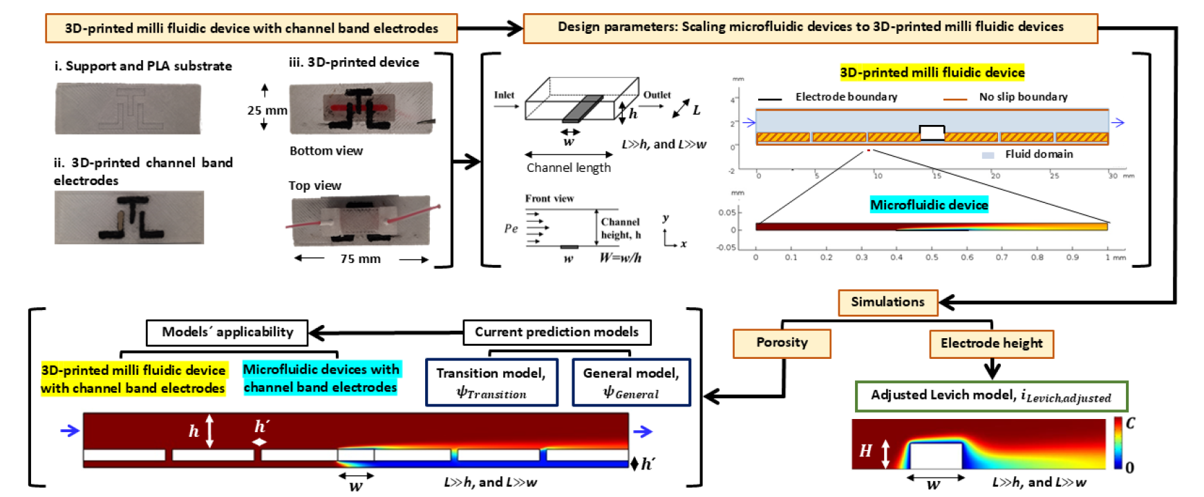 Meanwhile, numerical simulations were used to study the steady-state amperometric responses of channel band electrodes in milli fluidic systems as a function of electrode shape, device porosity, and flow rates, enabling the formulation of analytical models using dimensionless design parameters. To ensure the reliability of the simulations, numerical computations were validated by replicating previous studies in micrometer-scale systems [