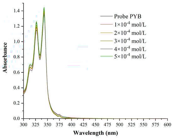 The UV-vis absorption spectra of Probe PYB in different concentrations of Cu2+ (1 × 10−4 mol/L–5 × 10−4 mol/L) are illustrated in Figure 1. Probe PYB was dissolved in a DMF(N,N-Dimethylformamide)/HEPES-NaOH buffer solution (5 × 10−4 mol/L, v:v = 1:1, pH 7.4) solution. The maximum absorption peak of blank Probe PYB appeared at 320 nm. Under the same testing environment, different concentrations of Cu2+ were added to the solution of probe PYB. The absorbance at 320 nm gradually enhanced with the increase of Cu2+ concentration. Therefore, in the subsequent determination of fluorescence emission spectra, 320 nm was used as the maximum excitation wavelength.