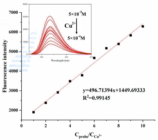 To clarify the sensitivity of Probe PYB to Cu2+, the fluorescence spectra of Probe PYB in different concentrations of Cu2+ (5 × 10−5 mol/L–5 × 10−4 mol/L) were tested (VDMF:VHEPES-NaOH buffer solution = 1:1, pH 7.4, λex = 320, λem = 362). As illustrated in Figure 2, it could be clearly observed that the fluorescence intensity of Probe PYB gradually decreased with the increase of Cu2+ concentration. When the molar ratio of the Probe PYB to Cu2+ reached 1:1, the fluorescence quenching rate was approximately 71%. By measuring the relationship between the maximum fluorescence emission intensities (362 nm) and Cu2+ concentrations, it was determined that this fluorescence quenching phenomenon conforms to a linear relationship (y = 496.71394x + 1449.69333, R2 = 0.99145), indicating that Probe PYB can perform quantitative analysis on Cu2+ and verifying its good sensitivity to Cu2+. And based on the detection limit formula (DL = 3 s/m, where s is the standard deviation of replication measurements, and m is the slope of the calibration curve), the detection limit of Probe PYB is calculated to be 8.35 × 10−7 M [21].