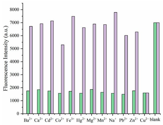 Selectivity is an important indicator for measuring the quality of fluorescent probes. In order to verify the selectivity of Probe PYB for different metal ions, several common metal ions (Ba2+, Na+, Mg2+, Zn2+, Cd2+, Ca2+, Mn2+, Pb2+, Cu2+, Hg2+, Fe3+, Co2+, 5 × 10−4 mol/L) were added to the Probe PYB (5 × 10−4 mol/L) solution under the same measurement conditions (VDMF:Vbuffer = 1:1, pH 7.4) and their fluorescence intensities were tested separately. As illustrated in Figure 3, the purple bar represented the maximum fluorescence emission intensities of Probe PYB in different metal ions (λex = 320 nm, λem = 362 nm). It could be obviously determined that only Cu2+ caused a significant decrease in the fluorescence intensity of Probe PYB, while other metal ions would not have a significant impact. To further verify the detection ability of Probe PYB for Cu2+, in complex environments, we also introduced competitive experiments as a reference. After inducing quenching of Probe PYB (5 × 10−4 mol/L) with Cu2+ (5 × 10−4 mol/L), 10 times the concentration of other metal ions (Ba2+, Na+, Mg2+, Zn2+, Cd2+, Ca2+, Mn2+, Pb2+, Hg2+, Fe3+, Co2+, 5 × 10−3 mol/L) were added and the fluorescence intensity of the system was measured (VDMF:VHEPES-NaOH buffer solution = 1:1, pH 7.4). The maximum fluorescence intensities at 362 nm were selected as experimental data. As shown in Figure 3, the green bar represents the competitive experiments. It could be found that the introduction of 10 equivalents of other metal ions did not significantly affect Cu2+ recognition based on fluorescence quenching. This meant that Probe PYB could still effectively recognize Cu2+ in the presence of high concentrations of interfering ions, and also verifies Probe PYB’s good qualitative analysis ability for Cu2+.
