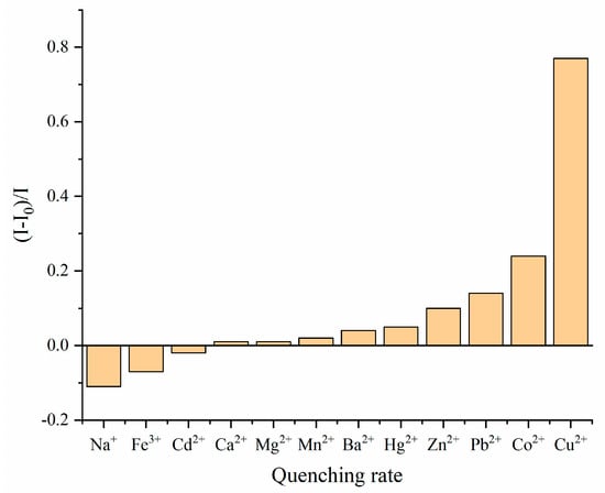 Moreover, the quenching rates of Probe PYB in above-mentioned ions were also measured. As illustrated in Figure 4, the quenching rate of Probe PYB induced by Cu2+ is very prominent, reaching 77%, which is significantly better than other metal ion.
