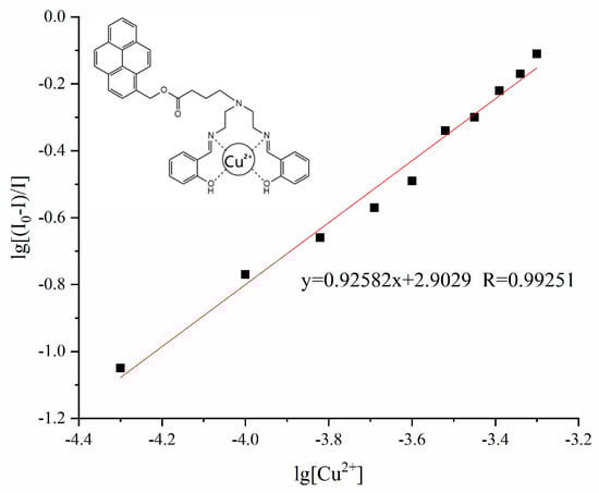 The Stern–Volmer equation (Equation (1)) was introduced to calculate the quenching constant and binding ratio of Probe PYB to Cu2+ [23]. Wherein, I0 is the fluorescence intensity of Probe PYB, I is the fluorescence intensity of Probe PYB induced by Cu2+, KSV is the Stern Volmer constant, n is the number of binding sites, and Q is the concentration of Cu2+. Based on the fluorescence intensity of Probe PYB under the condition of Cu2+ concentration from 5 × 10−5 M to 5 × 10−4 M, the equation is calculated to be y = 0.92582x + 2.9029. By calculating the slope of the equation, n is equal to 0.92, approximately equal to 1, indicating that the coordination ratio between Cu2+ and Probe PYB is 1:1. And according to the intercept of the equation, the quenching constant can be calculated to be 799.65 M−1. Based on the coordination atoms present in the probe molecule and relevant literature reports, we have plotted the coordination model between Probe PYB and Cu2+ in Figure 5.