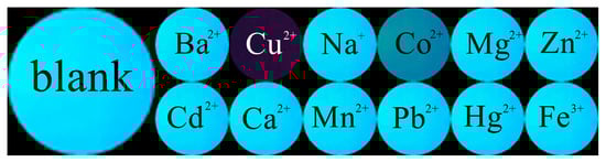 In addition, filter paper was selected as the carrier for Probe PYB for convenient and rapid detection of Cu2+. The test strip for detecting copper ions was prepared by uniformly dropping Probe PYB solution onto neutral filter paper and drying it. Subsequently, solutions of the above-mentioned metal ions were dropped onto the surface of the test paper and placed under the irradiation of ultraviolet light, as shown in Figure 6, only Cu2+ induced fluorescence quenching of the test strip, while other metal ions did not significantly affect the fluorescence signal of the test strip.