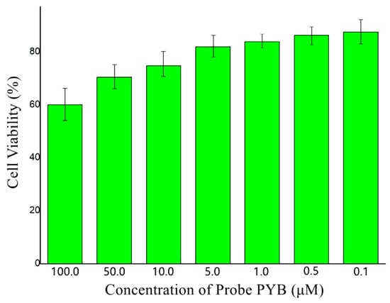 In order to expand the application of Probe PYB in the field of biology, the biocompatibility of Sensor PYB was assessed in HepG2 cells. The MTT assay was performed to confirm the cytotoxicity in different concentrations of Sensor PYB (0.1–10 µM). As illustrated in Figure 7, the cell viability had no dramatic differences within the concentration range of 0.1–5 µM, when the concentration of Sensor PYB reached 10 µM or above, cell viability began to decrease. Even so, at the highest concentration of 100 µM, the cells maintained fine viability (59%), and the IC50 value was 171.5 µM. So the cytotoxicity of Sensor PYB was relatively low under the experimental conditions.