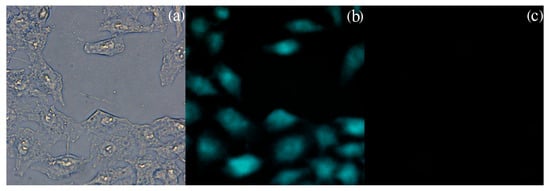 Furthermore, we conducted fluorescence cell imaging experiments on HepG2 cells using Probe PYB. The pre-cultured HepG2 cells were removed from the incubator, the cell culture medium was aspirated using a micropipette and washed 3 times with phosphate-buffer solution (pH = 7.4) to ensure removal of the medium. Then added Probe PYB solution (1 × 10−5 M in DMSO) to the cell culture plate, and cultivated for 30 min at room temperature to ensure Probe PYB completely entered the cells. Afterwards, washed the cells 3 times with buffer solution and transferred to a fluorescence microscope for observation. As shown in Figure 8a, the cell outline was clear and complete, indicating that Probe PYB did not cause damage to the cells. From Figure 8b, it could be observed that the cells treated with Probe PYB exhibited significant fluorescence emission, indicating that the probe could penetrate the cell membrane and be adsorbed by the cells. Subsequently, 1 × 10−5 M Cu2+ buffer solution (pH 7.4) was added to the cells and cultured for 30 min. The corresponding fluorescence imaging is shown in Figure 8c. After interacting with Cu2+, the fluorescence of cells treated with Probe PYB significantly disappeared, indicating that Probe PYB coordinated with Cu2+ inside the cell and demonstrating its good biocompatibility.