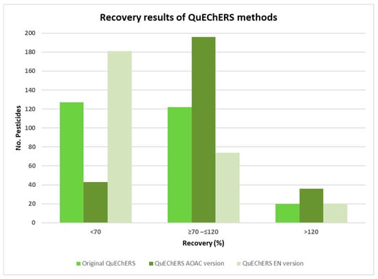 Recovery results of the Original QuEChERS, QuEChERS AOAC, and QuEChERS EN methods.