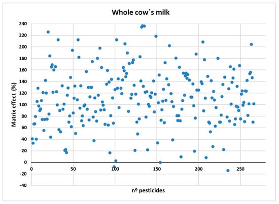 Matrix effect (%) comparing the slope of the curve in solvent and in whole cow’s milk.