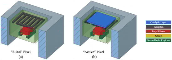 Schematic cross-section of a GMOS sensor showing (a) a blind pixel and (b) an active pixel. Each pixel consists of a transistor, an embedded tungsten layer functioning as a heating resistor, and, in the active pixel, a catalytic layer. When a voltage is applied to the resistor, it heats both pixels to the ignition temperature of the analyte gas. In the active pixel, the catalytic layer initiates combustion of the analyte, producing an additional temperature rise, whereas the blind pixel, lacking a catalyst, remains at the baseline heater temperature. This temperature increase in the active pixel alters the current-voltage characteristics of its sensing transistor. During operation, the voltage difference between the blind and active transistors is measured, yielding a response proportional to the reaction-induced temperature change .