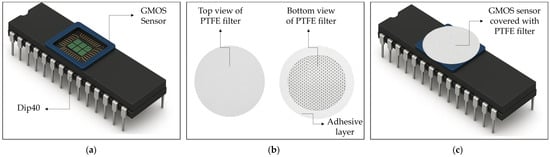 Schematic illustration of (a) the GMOS sensor on a DIP-40 package, (b) the PTFE filter from top and bottom views showing the adhesive ring, and (c) the GMOS sensor covered with the PTFE filter.