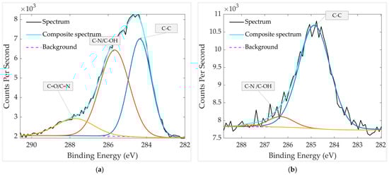 The comparison of the chemical states of C 1s is presented in Figure 10. In the aged sample without thermal treatment (Figure 10a), high-resolution C 1s fitting reveals three main components at 284.3 eV, 285.7 eV, and 288.0 eV, corresponding to C–C, C–OH/C–N, and C=O/C=N species, respectively. The presence of multiple oxygen- and nitrogen-containing carbon bonds indicates surface contamination by organic residues and absorbed molecules. In contrast, after thermal treatment (Figure 10b), the spectrum contains only two detectable components at 284.8 eV (C–C) and 286.3 eV (C–OH/C–N). The second peak intensity decreases while the C=O/C=N peak at 288.0 eV nearly disappears, confirming the effective removal of oxidized carbon species during heating. The substantial reduction of oxygenated and nitrogen-containing carbon is consistent with the almost disappearance of N 1s in the spectrum of the heated sample (Figure 7b, Table 2), supporting thermal decomposition or desorption of heterocyclic contaminants such as pyridine- or quinoline-like molecules.
