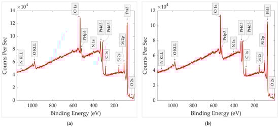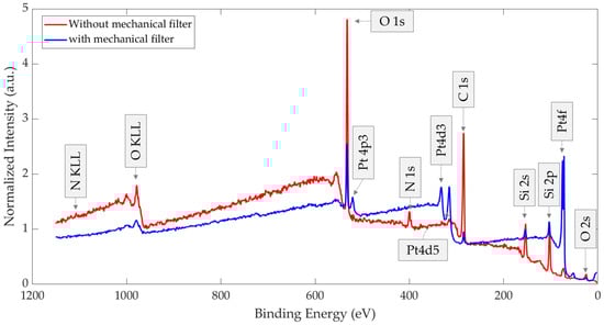 Figure 12 presents the XPS survey spectra of the two thermally treated GMOS samples, stored either without or with a mechanical filter. A normalized comparison of these spectra is provided in Figure 13, with each spectrum normalized to its respective Si 2s peak (154.02 and 154.06 eV, respectively). Relative to the Si 2s peak, the filtered sample shows a stronger Pt 4f signal together with a weaker C 1s signal, and the N 1s peak is nearly undetectable. Because both spectra are scaled to the substrate (Si 2s), these differences reflect true changes in the surface layer: the mechanical filter limits adsorption of airborne carbon- and nitrogen-containing species, thereby reducing overlayer contamination that would otherwise attenuate Pt, and leaving a larger fraction of Pt surface exposed after storage.