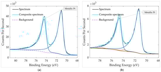HR XPS scan of Pt groups in aged and thermally treated GMOS samples: (a) without mechanical filter and (b) with mechanical filter. The spectra were recorded over a binding-energy range of 65–80 eV.