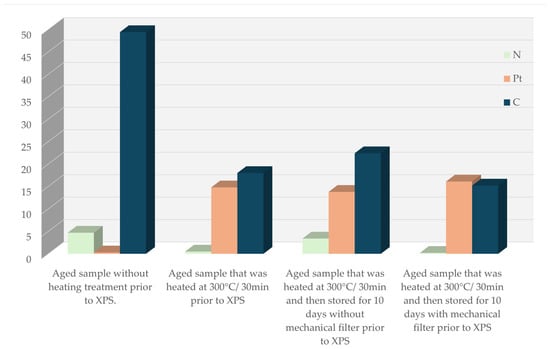 The initial assumption guiding this study was that the fresh, unaged device would exhibit the cleanest catalytic surface, consisting predominantly of exposed metallic Pt with minimal contamination. By contrast, aged samples stored under ambient conditions were expected to accumulate adventitious carbon and oxygen-containing species, reducing Pt visibility in XPS. Thermal treatment was anticipated to remove a significant portion of this surface contamination, whereas filtration during storage was expected to limit re-adsorption of airborne hydrocarbons and oxidizing species. The results obtained from SEM, EDX, and XPS confirm this expectation.